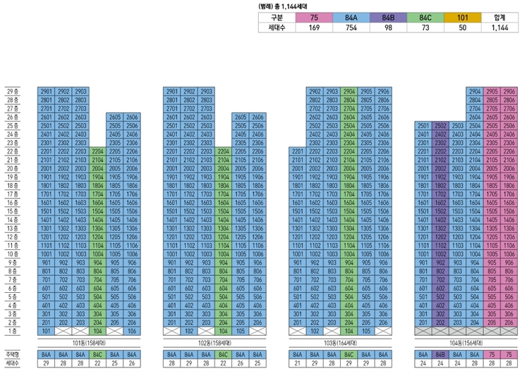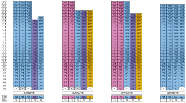 포항 아이파크 아파트의 동호수 배치도에서 가장 눈에 띄는 부분은 가장 많은 분양세대를 보유하고 있는 84A타입은 모든 동에 속해 있다는것 인데요 어느 동에서든지 84A 타입을 만나볼 수 있어서 오히려 선택이 쉬울 것으로 예상이 되기도 합니다. 다만 너무 많은 사람들이 몰릴 경우 경쟁률이 올라갈 것을 대비해서 다양한 전략이 필요할 것 같은 부분이기도 합니다. 넓은 집을 선호하시는 분들이 선택하는 101 타입의 경우 106동, 107동에 배치되어 있다는 점도 동호수 꼭 동호수 배치도를 살펴봐야 하는 이유이기도 합니다.