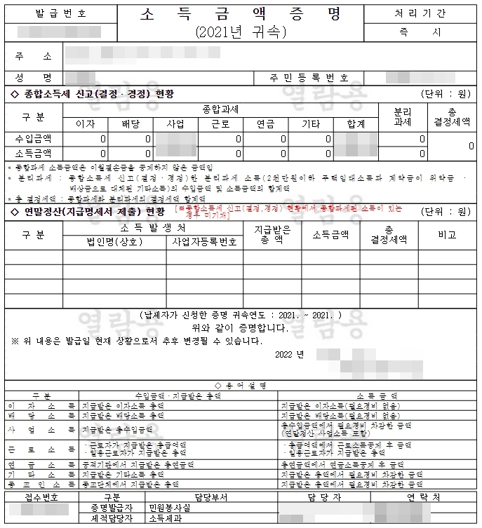 한 개인의 1년간 소득을 확인하는 방법의 서류인 소득금액증명원은 종합소득세를 신고한 사람들에 한해 발급받을 수 있습니다. 만약 종합소득세를 신고하지 않았다면 소득금액증명이 어려운 부분이 있다는 것을 참고하세요